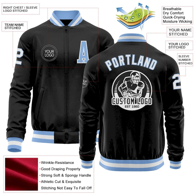 Custom Black Light Blue-White Bomber Varsity Letterman Zipper Jacket