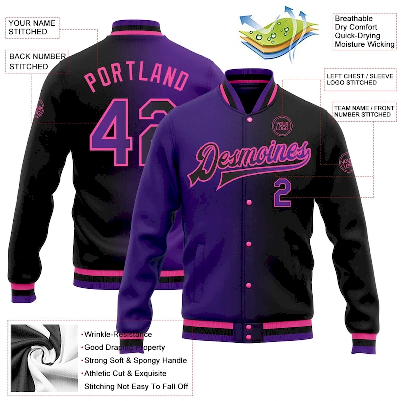 Custom Black Purple-Pink Bomber Full-Snap Varsity Letterman Gradient Fashion Jacket