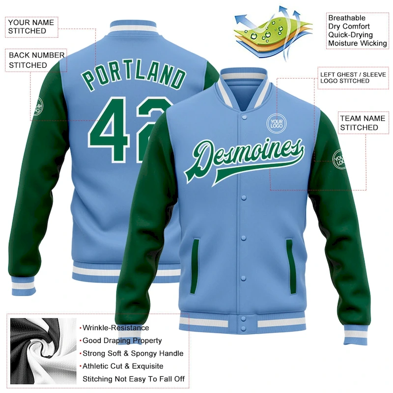 Custom Light Blue Kelly Green-White Bomber Full-Snap Varsity Letterman Two Tone Jacket